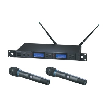 AEW-R5200C雙接收機(jī)和兩個(gè)AEW-T3300aC心形電容話筒/發(fā)射器。