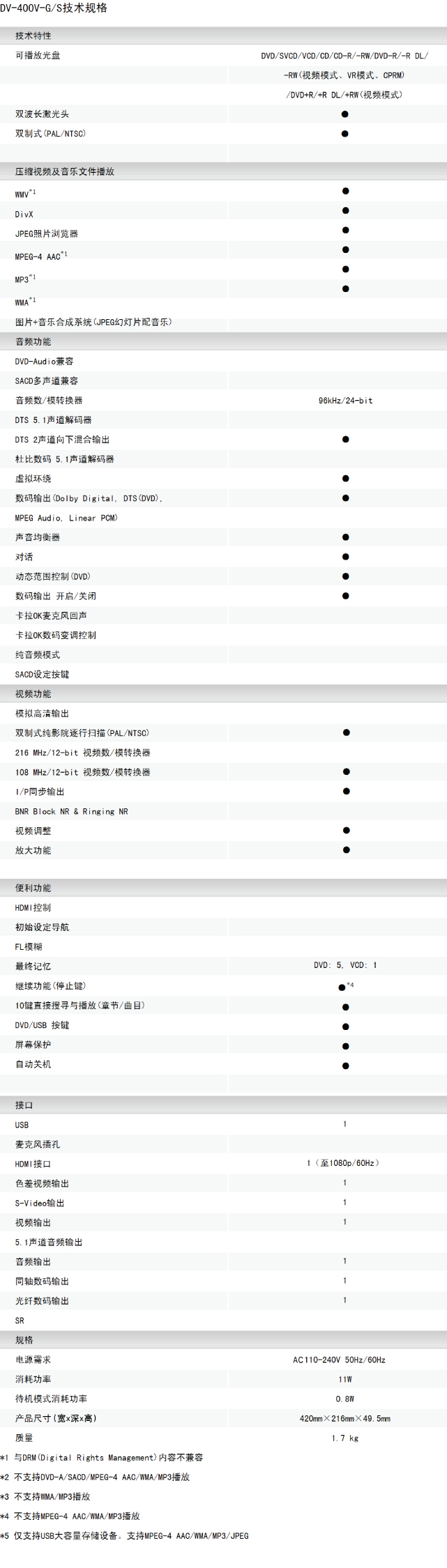 先鋒DV-400V-G/S 音頻數/模轉換器:96kHz/24-bit,DIS2聲道向下混合輸出,虛擬環繞,數碼輸出(Dolby Digital,DTS(DVD),MPEG Audio,Linear PGM),聲音均衡器,對話,動態范圍控制(DVD),數碼輸出:開啟/關閉,視頻數/模轉換器:108 MHz/12-bit,I/P同步輸出,視頻調整,放大功能