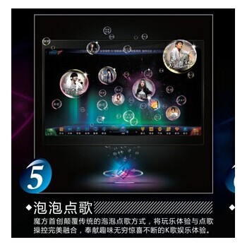 視易魔方3D點歌系統(tǒng)凝聚了蘋果(iOS)、谷歌 (Android)、微軟(WP)、百度(Baidu)、視易等全球數(shù)十萬最優(yōu)秀工程師的智慧結(jié)晶,以智能觸控、3D引擎、智能搜索、高清視頻等全球領(lǐng)先 技術(shù),展現(xiàn)3D立體滑屏、飛刀式切換、泡泡點歌、K歌百度等數(shù)十項行業(yè)首創(chuàng)功能,更添加時下最時尚最智能最具價值應(yīng)用:手機(jī)K米點歌,音樂、燈光和設(shè)備智 能聯(lián)動,電視端和點歌臺廣告植入,不同風(fēng)格皮膚熱切換,為用戶呈現(xiàn)盡善盡美的娛樂體驗,為K場提供更增值的解決方案。