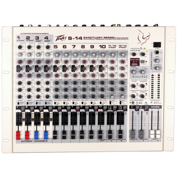 S-14 有 10 個 XLR 麥克風和兩個帶有反饋消除器的立體聲線性輸出,這款系列的最大的優點就是它的大部分功能都能自動控制。它帶有嵌入壓縮的四個自動混音聲道。 S-14P 可以自動處理像轉換聲音和調低當前不使用的聲音量功能。這些聲道上有一個壓縮電路可以保持聲音不會太大或者太小。這款設備在每個聲道上都配有雙波 EQ , Mid-Morph 控制器可以增強聲音的清晰度而且可以消除非標準空間產生的嗡嗡聲。 S-14 有一個嵌入式的數字混響和聲音加強器,使用它可以彌補聲音混響效果。此外,S- 14含有數字混響與4個預置和啞音;聲音增強;壓縮;幻象電源以及多種功能。