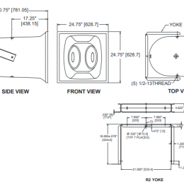 音箱系統(tǒng)是倒相式設(shè)計(jì),箱體內(nèi)含了兩個(gè)12”驅(qū)動(dòng)。箱體是手工層壓式玻璃纖維,可抵抗天氣和紫外線(xiàn)。輸入連接是一根12’(4m)SJOW#16儀表電纜,帶有剝線(xiàn)端。箱體為完整的雙層密封淺灰色玻璃纖維外殼,帶有3層全天候型網(wǎng)罩。鋼制網(wǎng)罩是粉末涂層,經(jīng)過(guò)了專(zhuān)利的富鋅環(huán)氧雙層粉末涂層過(guò)程,灰色與箱體相搭配。該系統(tǒng)是IP54W的IEC529 IP級(jí)別,向下投射角最小值為5°。箱體有5個(gè)1/2-13索具點(diǎn),提供了多個(gè)安裝選項(xiàng)。此外,音箱還提供了1個(gè)富鋅環(huán)氧雙層粉末涂層鋼制軛式支架。音箱系統(tǒng)的振幅響應(yīng)為40Hz-150Hz(+/-2dB SPL), 輸入能力是400W,在標(biāo)稱(chēng)阻抗4Ohm,50Hz-125Hz下是92dB SPL靈敏度@2.0V/1米。標(biāo)稱(chēng)覆蓋為全指向。音箱箱體尺寸為24.75” ×24.75” ×30.75”(高寬深),重量是87lbs。