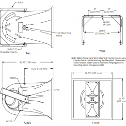 系統的振幅響應是80Hz至10kHz(+/-6dB),輸入能力是40V RMS,在m/2.83V和8歐的阻抗下靈敏度為107dB。從1250Hz至10kHz的標稱覆蓋是50°H×20°V。音箱的尺寸為24.75英寸(629mm)H×24.75英寸(629mm)W×30.75英寸(781mm)D,重量為102.5lbs(46.5kg)。