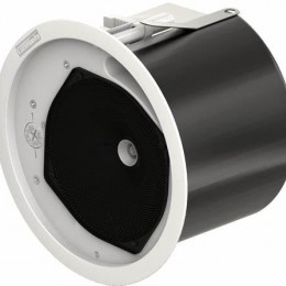 音箱系統將會是兩分頻、全頻吸頂式音箱,帶有6.5英寸低頻換能器還有同軸安裝的3/4英寸開口高頻壓縮驅動單元。驅動連接一個分頻頻率是2kHz的分頻器, 還有一個自復位斷路器以保護驅動。可涂層的音箱障板是由UL 94V-0 ABS 材料構成。后箱體是防腐鍍鋅鋼構造,具有彈簧式dro-StopTM安裝輔助扣。它還包括了隱藏式的終端盒,上面的鎖定連接頭可拆卸,螺栓型端子則為了保護有環通功能的導線終端。夾緊機構將能提供溢放口用于高壓電纜或導管。這套系統的振幅響應是70Hz至13.5kHz(-10dB),低阻抗(8歐)輸入能力是22V RMS。處于1W/1m的靈敏度是91dB SPL(100 Hz到12.5kHz, 1/3倍頻帶)。系統的錐形范圍是120°(500Hz至6kHz ±65°)。標稱系統阻抗是8歐(低阻抗設置中)。系統配備了30W高性能自耦變壓器,在70.7V或是100V的分布式音頻系統中可使用,另外70.7V分布系統中可用30W,15W,7.5W, 3.75W抽頭(100V系統中可用30W,15W,7.5抽頭)。前面的擋板設有一個正面抽頭切換開關,隱藏在可拆卸的網罩里,可以方便的選擇自耦變壓器和低阻抗設置。系統還包括了兩個支撐橋軌和兩個墊片支撐橋軌。它的面板直徑是9.80英尺(248.9mm),箱體深度是6.49英尺(164.8mm),重量為7.1 lbs(3.2kg)。如果音箱要安裝在現存的一個大的后箱體里或是安裝在一個較長直徑為11英寸的(279mm)墻孔中,可選的外殼轉換器/調整環就可以用上了,在干式墻或者石膏到位前,新的構筑支架便可用于安裝音箱系統。