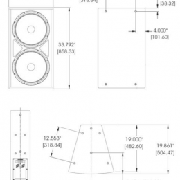 音箱系統是前方加載、倒相孔配置的超低音音箱系統,擁有2個15英寸冷卻音圈TM 低頻驅動,1個4-終端阻隔帶和2個NL4-兼容鎖定接頭。音箱箱體是13層壓波羅的海樺木構造,Tuf-Coat?涂層,擁有23xM10和4xM8飛掛/索具點。箱體前方配有16 規格開孔式鋼制網罩,有泡沫做支撐。系統的振幅響應是55Hz至100Hz(+/-3dB),輸入能力是69V RMS,靈敏度在2.83V/4歐姆標稱阻抗下為100dB @1m。標稱覆蓋指為360°Hx180°V。音箱尺寸是30.42英寸(773mm)高x 16.00英寸(407mm)寬(前)x 6.83英寸(173mm)寬(后)x18.26英寸(464mm)深,重量是112lbs(50.8kg)。