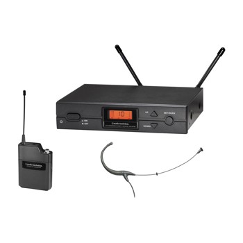 ATW-R2100a接收器和ATW-T210a UniPak麥克風系統發射器與BP894cW MICROSET心形電容頭戴式話筒。包括防風罩和衣服夾。