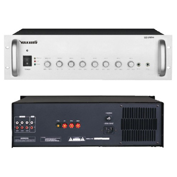 采用先進高效功率放大電路,設有2路話筒輸入,3路線路輸入,1路輔助輸出, 電壓輸出為70V/100V,定阻輸出為4-16Ω,輸出功率為360W,輸出頻響范圍為100~16KHz;每路輸入音量可獨立控制,帶有高低音音量調節;話筒1設為最高優先功能,自動抑制其他輸入信號;設備設有異常工作保護警告功能,當輸入信號過大、負載過重、溫度過高、線路短路時,對應的指示燈提示,有極高的可靠性。 2U標準機箱設計,鋁合金面板,美觀實用。箱體尺寸485*88*400mm,電源功耗為612W