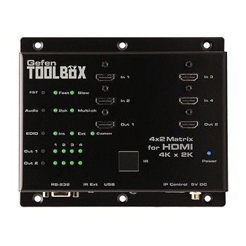 對于HDMI 4Kx2K的gefentoolbox 4X2矩陣是一個小巧輕便的替代安裝在機架上的矩陣。它允許多達四的超高清4K x 2K或全高清1080p源被路由到兩超高清顯示器。該產品支持分辨率高達4K x 2K(3840 x 2160 @ 30Hz)。HDCP,顏色深,3DTV的經過,以及無損音頻格式如LPCM 7.1,Dolby TrueHD和DTS-HD音頻,還支持。每個高清源可以被路由到所連接的顯示器使用前面板按鍵控制,包括紅外遙控,RS-232串行控制接口,或通過使用Telnet,IP,UDP,和內置的Web服務器接口。LED指示器頂部面板上顯示當前的路由狀態,FST模式,音頻配置,和EDID設置。