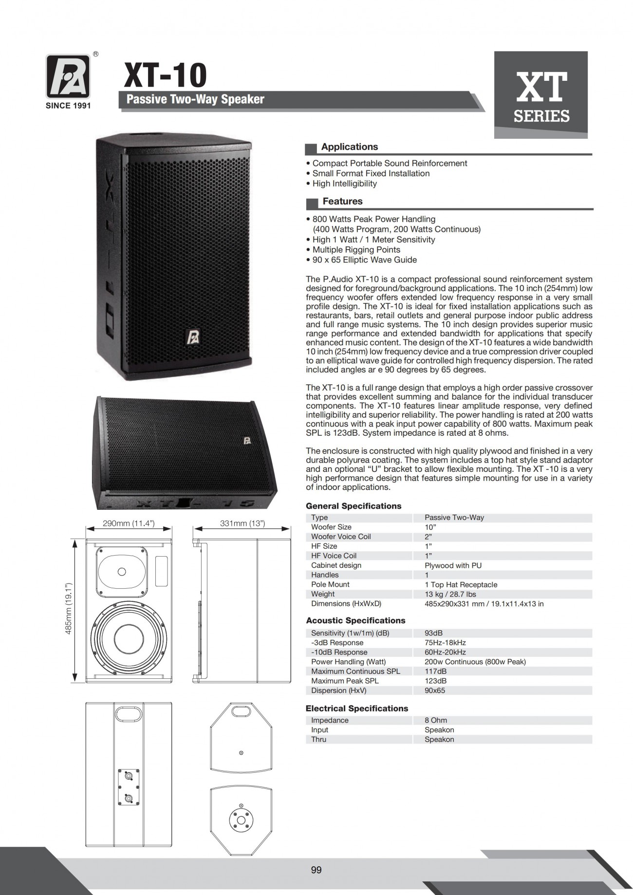 -10dB頻響:50 Hz - 20k Hz