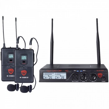 U-2100 LT/O無線領夾系統包含1臺U-2100雙通道無線接收機,2只U-1100LT腰包式發射機,2只LM-14O全向形微型領夾話筒。