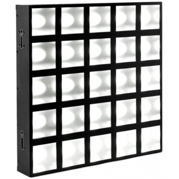 這白色的頻閃/眼罩是一個5×5 LED矩陣面板單獨控制的LED是由馬丁親高峰系列。可通過多個DMX選項或聲音激活,它包括預編程的影響,容易產生圖形信息的字母和數字的宏。連接通過一個集成的水平和垂直的鎖緊機構。