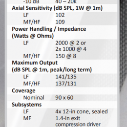 功率處理/阻抗(W @ 歐姆):低頻(單功放):2000 @ 2,低頻(并聯(lián)功放):1000 @ 4(2x),被動中頻/高頻:150 @ 8
