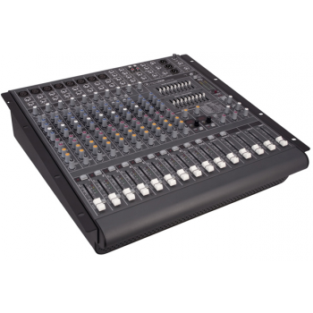 功能全面的12通道1600W桌面有源調音臺,每個通道上有4段LED電平表和獨奏推子前監聽按鈕
