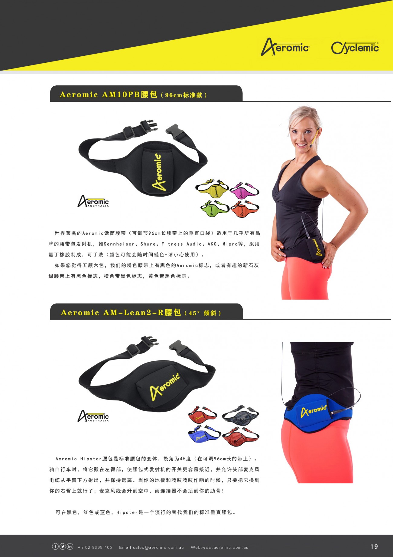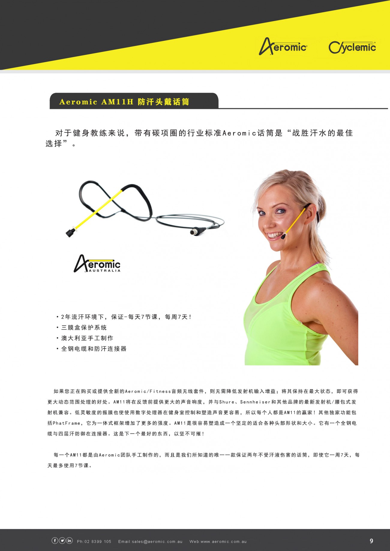 Aeromic和Cyclemic話筒都是防汗頭戴式話筒,每天最多可使用7節課,并提供兩年“無汗”保修。它們是由彼得·佩斯利在悉尼設計的,由彼得的公司和AMA在一家合資企業中制造。AMA還以健身音頻分銷商的身份進行交易,為其在澳大利亞和全球的分銷商和經銷商網絡提供服務。