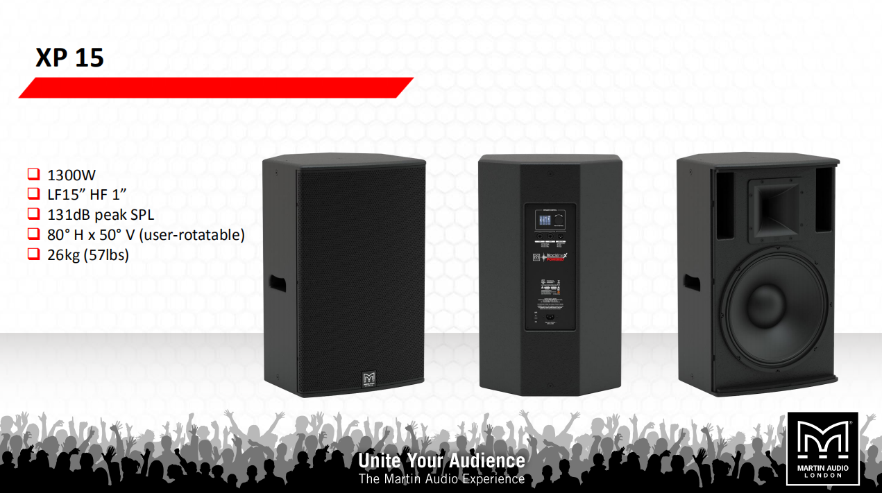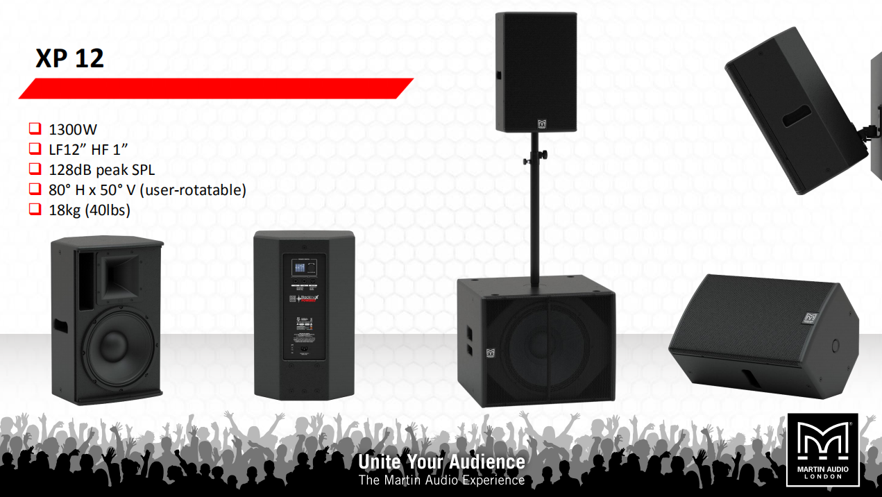 瑪田Martin audio XP12配有一個12英寸(300毫米)低頻驅動器和一個1英寸(25毫米)出口壓縮驅動器,安裝在一個80°x