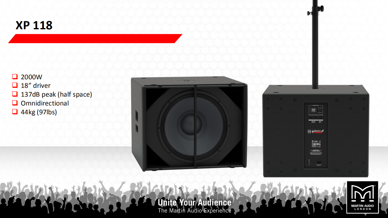 瑪田Martin audio XP118外殼是為道路建造的,由耐用的膠合板制成,表面涂有紋理的黑色油漆。一個穿孔的鋼格柵保護司機,和外殼有一個35毫米桿安裝在頂面插座和兩個符合人體工程學的側把手。